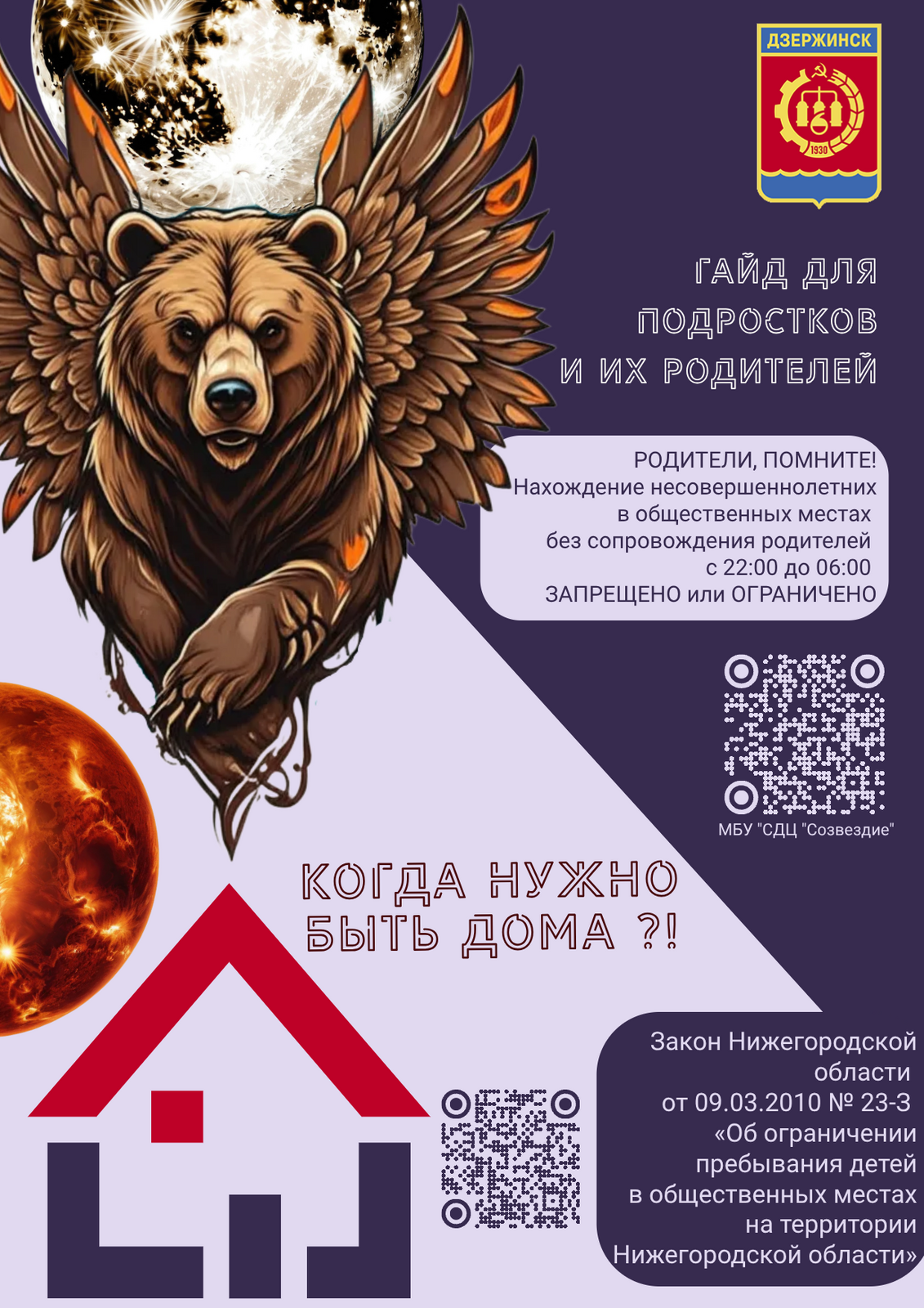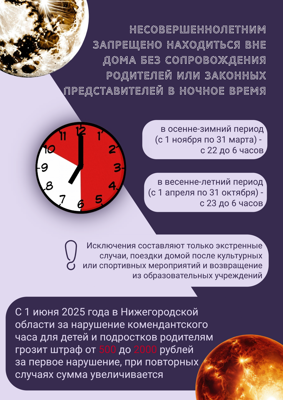 Напоминаем вам о Законе Нижегородской области от № 23-З «Об ограничении пребывания детей в общественных местах на территории Нижегородской области» принят 9 марта 2010 года. Настоящий Закон разработан в целях предупреждения причинения вреда здоровью детей, их физическому, интеллектуальному, психическому, духовному и нравственному развитию, профилактики безнадзорности и правонарушений несовершеннолетних на территории Нижегородской области.